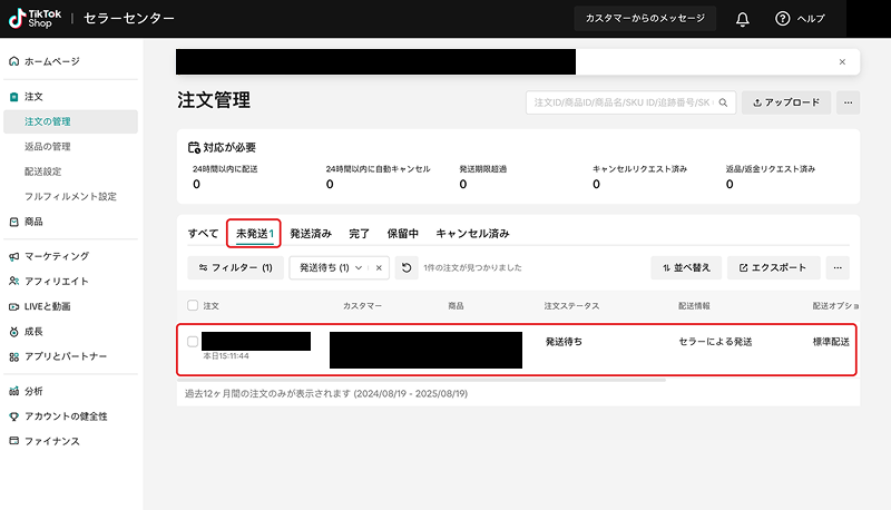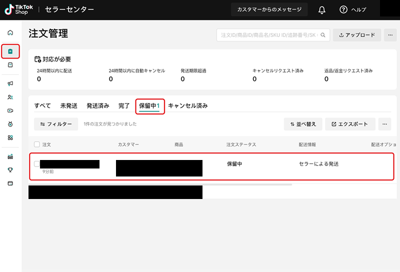 お客様がTikTokアプリ(スマホアプリ)で商品を購入すると、TikTokセラーセンターの「注文の管理」画面内に「保留中」ステータスで注文情報が反映されます。