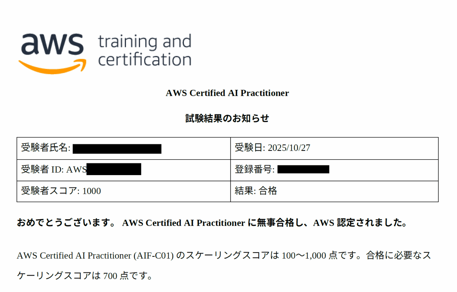 私事ですが、先日、AWS認定試験 AWS Certified AI Practitioner(AIF)を取得しました。