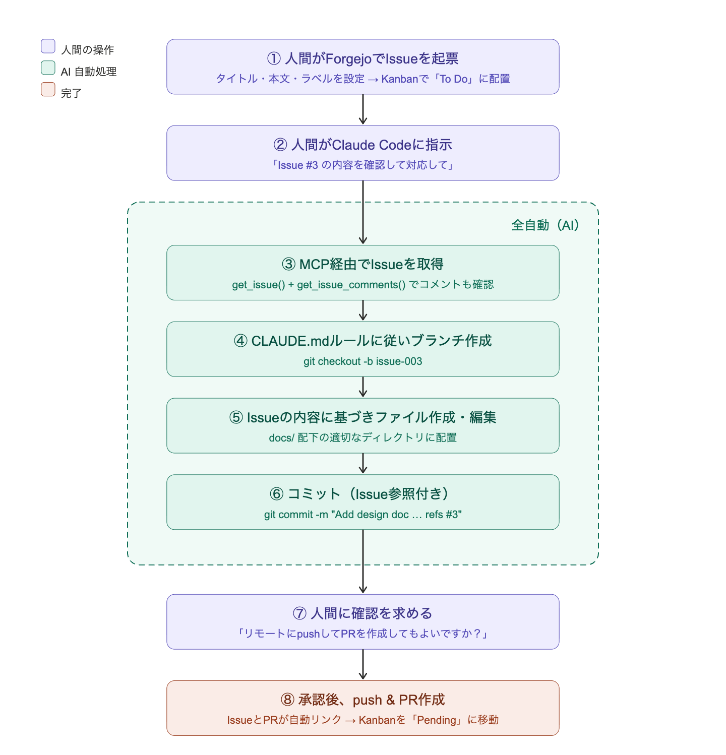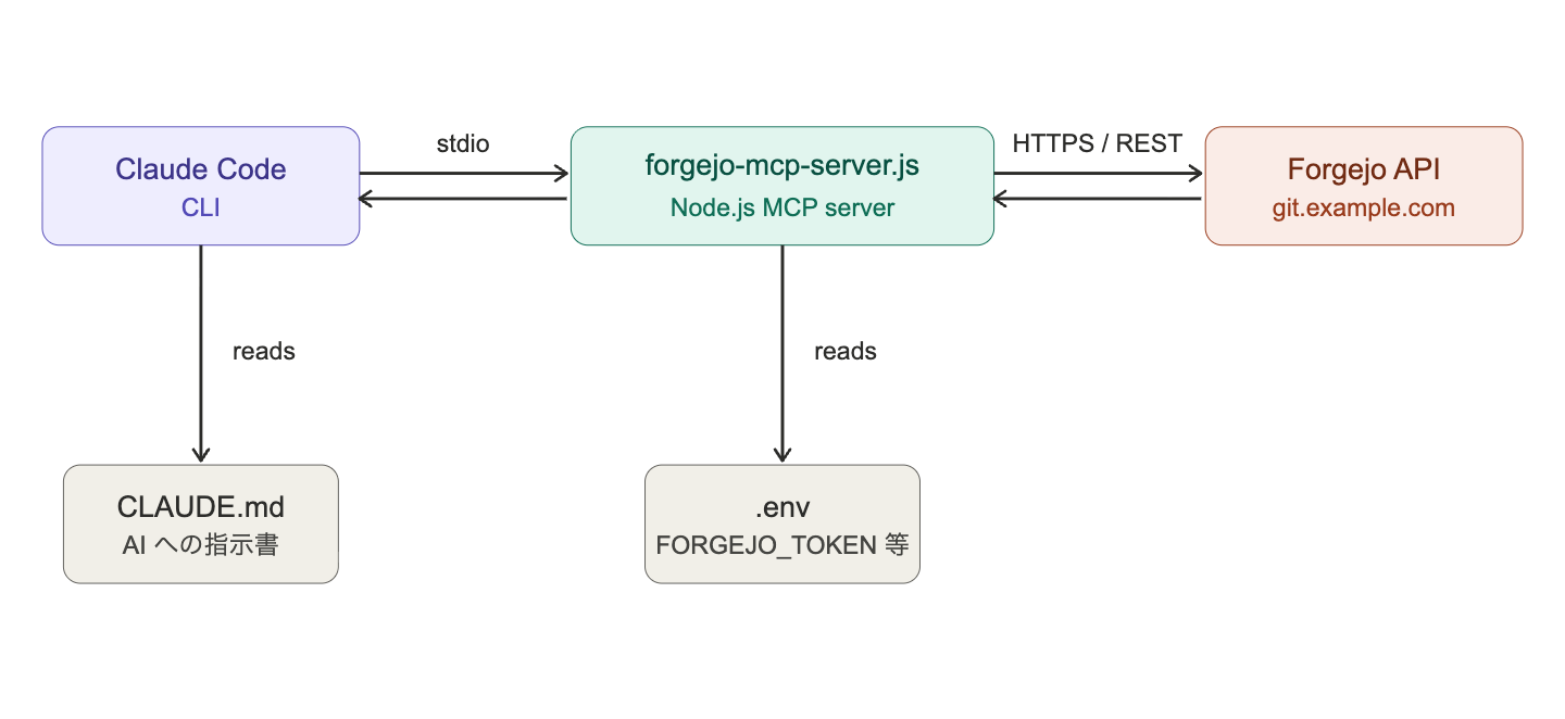 しかし、Claude CodeはデフォルトではForgejoのAPIにアクセスする手段を持っていません。そこで活用したのが MCP(Model Context Protocol) です。MCPサーバーを自作することで、Claude CodeにForgejo APIへの「目と手」を与え、Issueドリブンな開発ワークフローを実現しました。